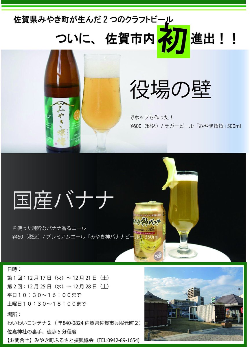 商品はホップのさわやかさが特徴の「みやき燦燦」と、糖度の高いバナナの甘い香りが際立つ「みやき神バナナプレミアムエール」の2種類。