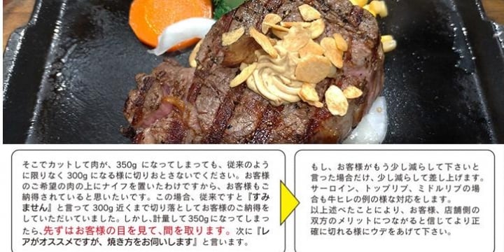 「いきなりステーキ」の社内報に、一瀬邦夫社長がステーキ肉のカット方法を解説した記事が掲載されたところ、客の希望よりも大きめに切ることを推奨しているようにも読めるとしてネットで話題になっている。