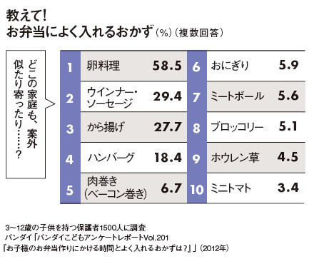 栄養面や子供の好み、さらにはこの時季、傷みにくさなどにも気を配るお弁当作り。ゆで卵や卵焼きなど、アレンジしやすく彩りも良い卵料理がトップなのは納得か。野菜は8位以下にようやくランクイン。肉中心で魚の出番が少ないのも、共通の課題といえそうだ。