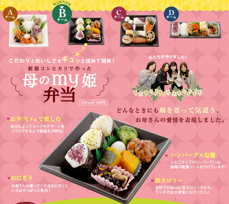 ナチュラルローソンによってブラッシュアップされた試作品の中から、『新潟コシヒカリで作った母のmy姫弁当』が選ばれた。336kcalという低カロリーさと税込398円という手軽さも選ばれた要因だろう。