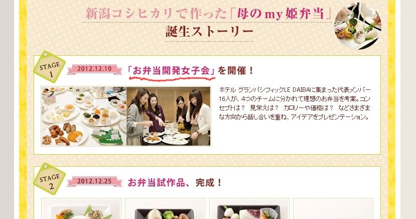 今回の企画は、OZmall会員にお弁当開発の協力が呼びかけられた。首都圏在中のOL16名が選ばれ、2012年12月に「お弁当開発女子会」を開催。新潟産コシヒカリを主役に使用することを条件に、おかずだけでなく、価格やネーミングも発案。