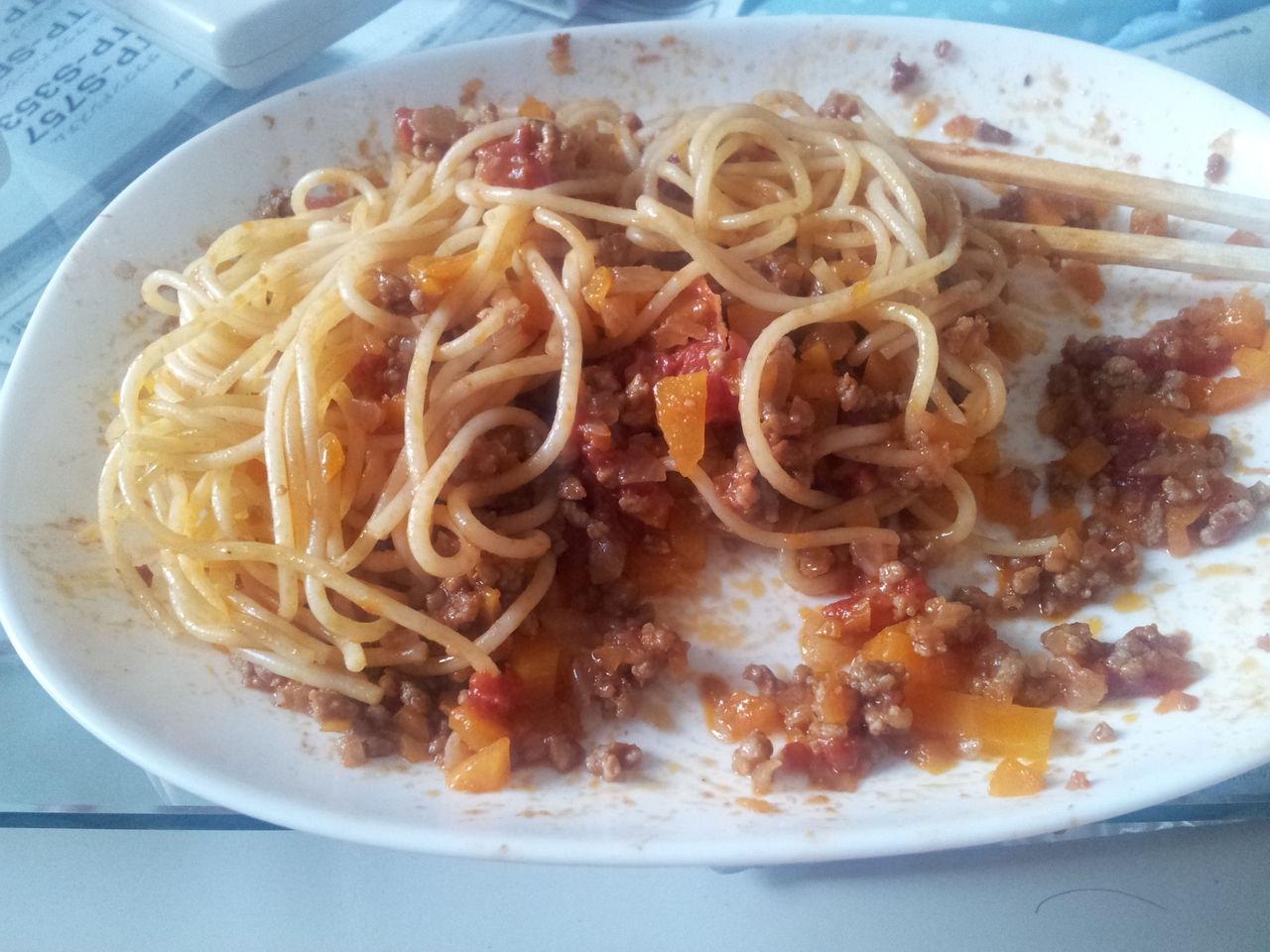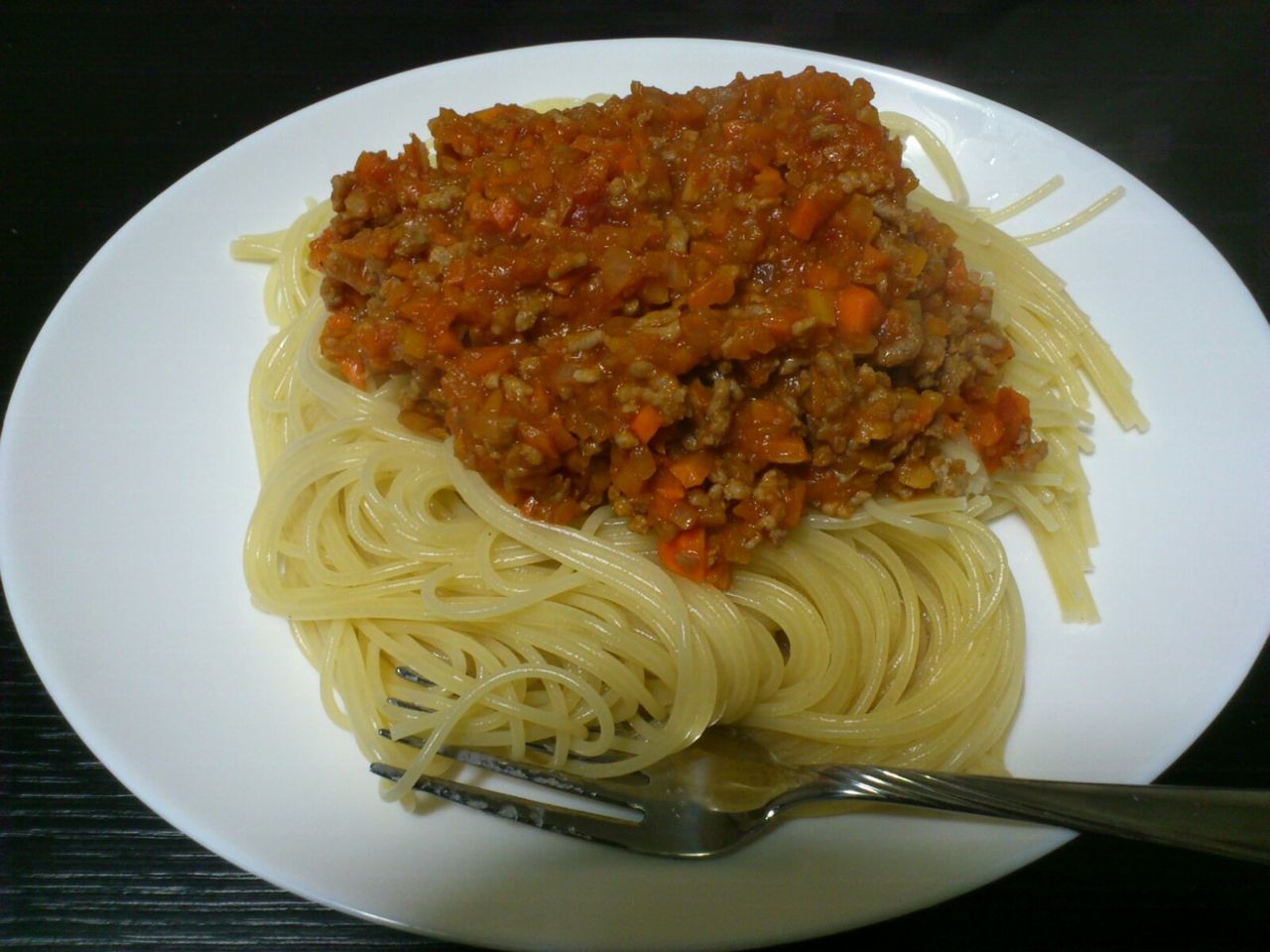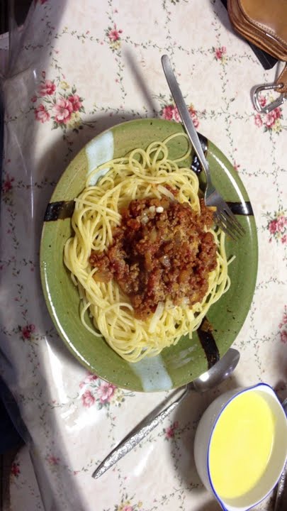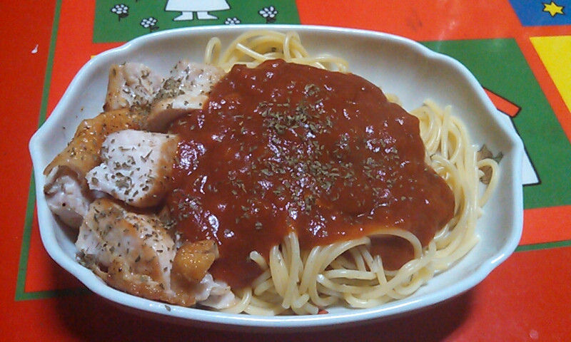 - 俺は固めでゆでたスパとミートソースの半分をフライパンで混ぜて皿に盛って上に残りのソース乗せてる