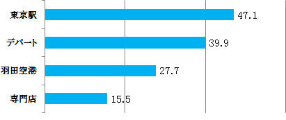 東京・神奈川・埼玉・千葉在住者に、東京土産を買っていくとしたらどこで購入するか尋ねたところ、1位は昨年秋にリニューアルした「東京駅」だった。東京駅でしか購入できない限定商品があることも理由のようだ。2位は「デパート」、3位は「羽田空港」がランクインしている。