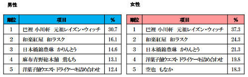 次に、東京・神奈川・埼玉・千葉以外に在住の668人を対象に、東京でしか買えないお土産で、もらえたらうれしいと思うものを尋ねた。1位は「麻布青野総本舗の鶯(うぐいす)もち」、2位は「和楽紅屋の和ラスク」、3位は「巴裡小川軒の元祖レイズン・ウィッチ」となっている。