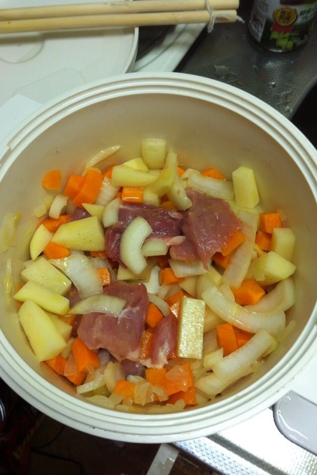 野菜切って水とルウ入れてレンチンです