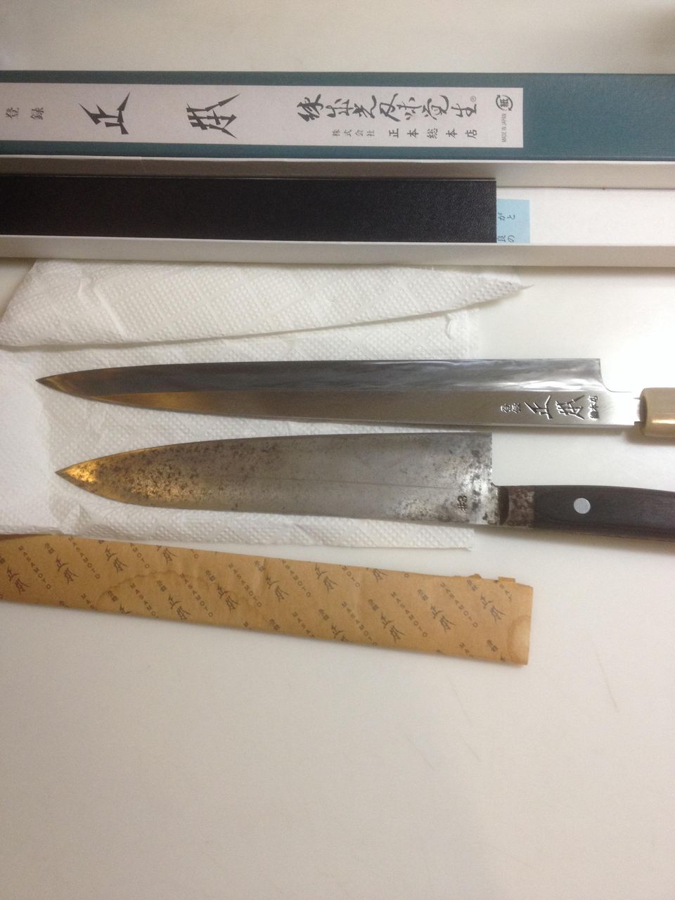 下の錆気味な包丁は卸す用の包丁ですが刃が薄いので良く切れますが欠けやすいのが難点ですが慣れれば骨を断つこともできます。
