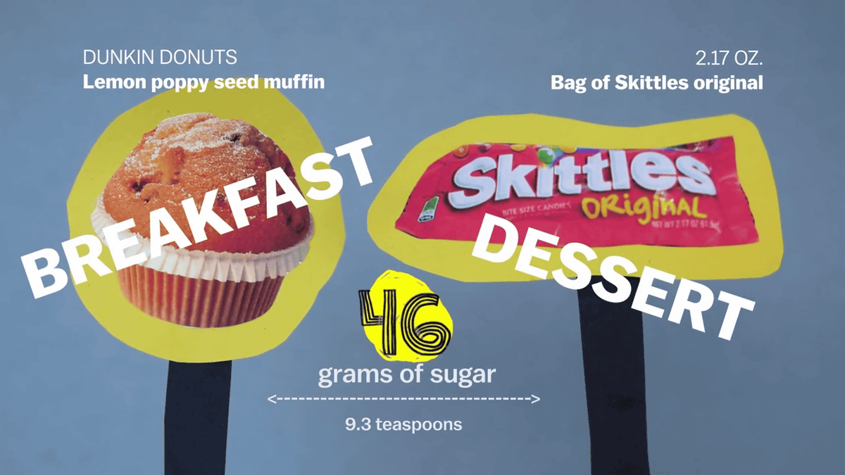 マフィンは「朝食」、スキットルズはお菓子なので「デザート」に分類されますが、糖分は46gで同じ。