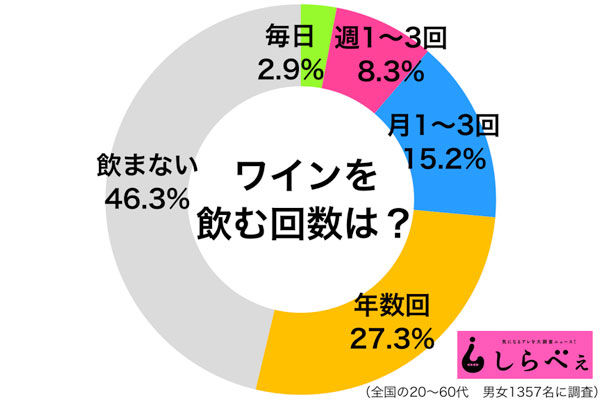 反面、まったく飲まない人も46%。20代、30代は5割を超えている。若者層は家でボトルを空けても飲みきれないので、敬遠する人も多いようだ。