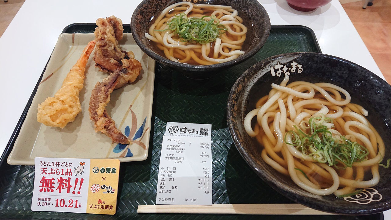 天ぷらは無料チケットなら実際はうどん2つで260円じゃん